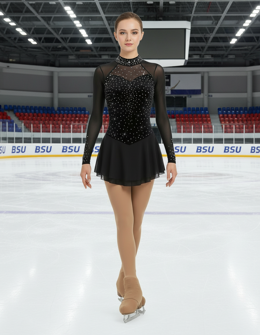 This competition figure skating dress combines elegance and performance with its long sleeves and sparkling crystal embellishments. Available in 10 vibrant colors, it allows skaters to showcase their style on the ice while benefiting from a design that supports freedom of movement and comfort during routines. Expertly crafted for both aesthetics and functionality, this dress is ideal for competitive skaters aiming to make a striking impression.