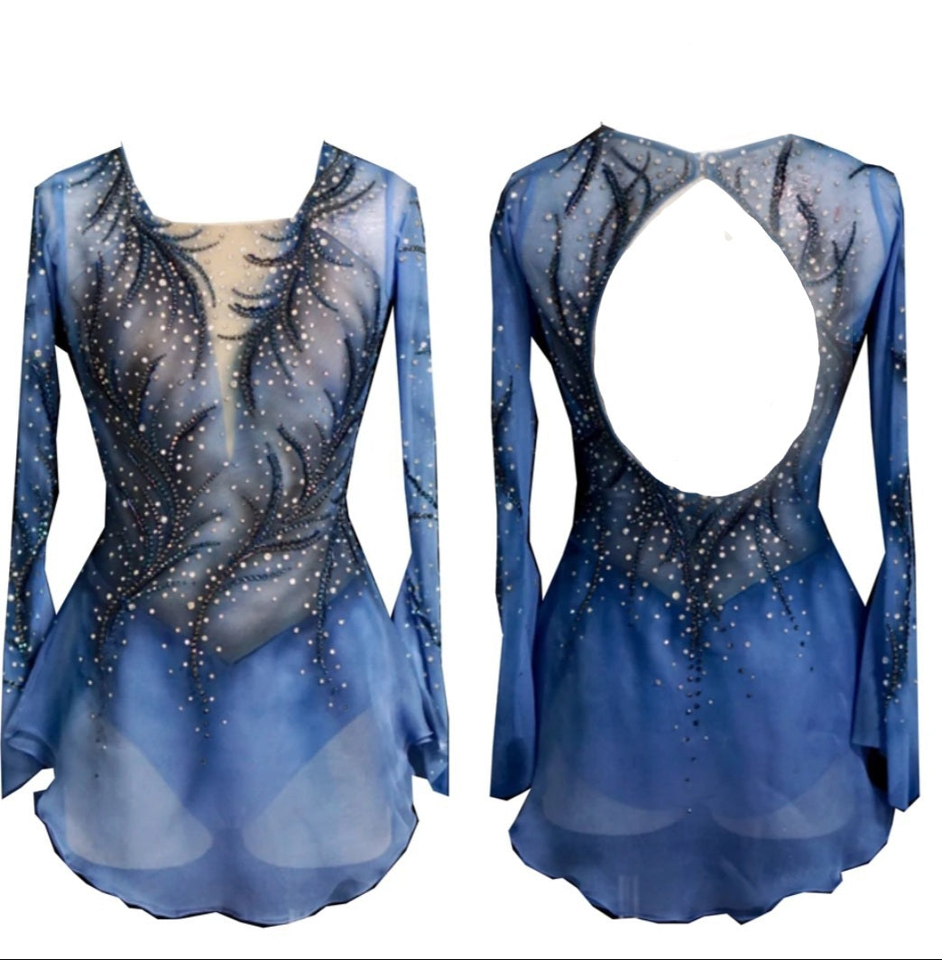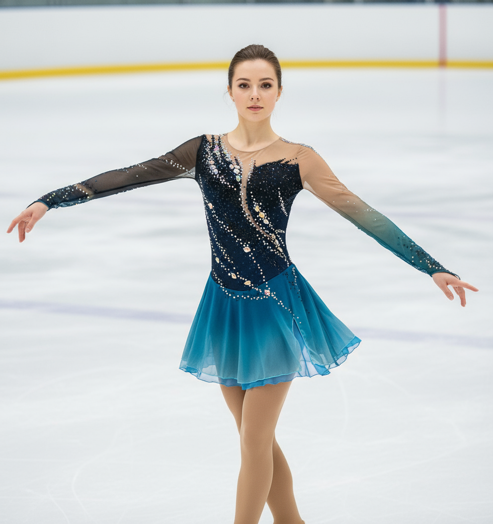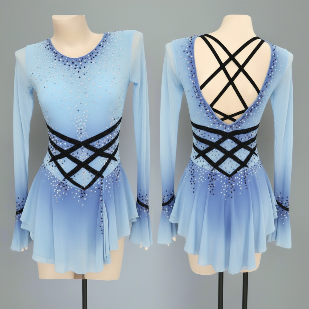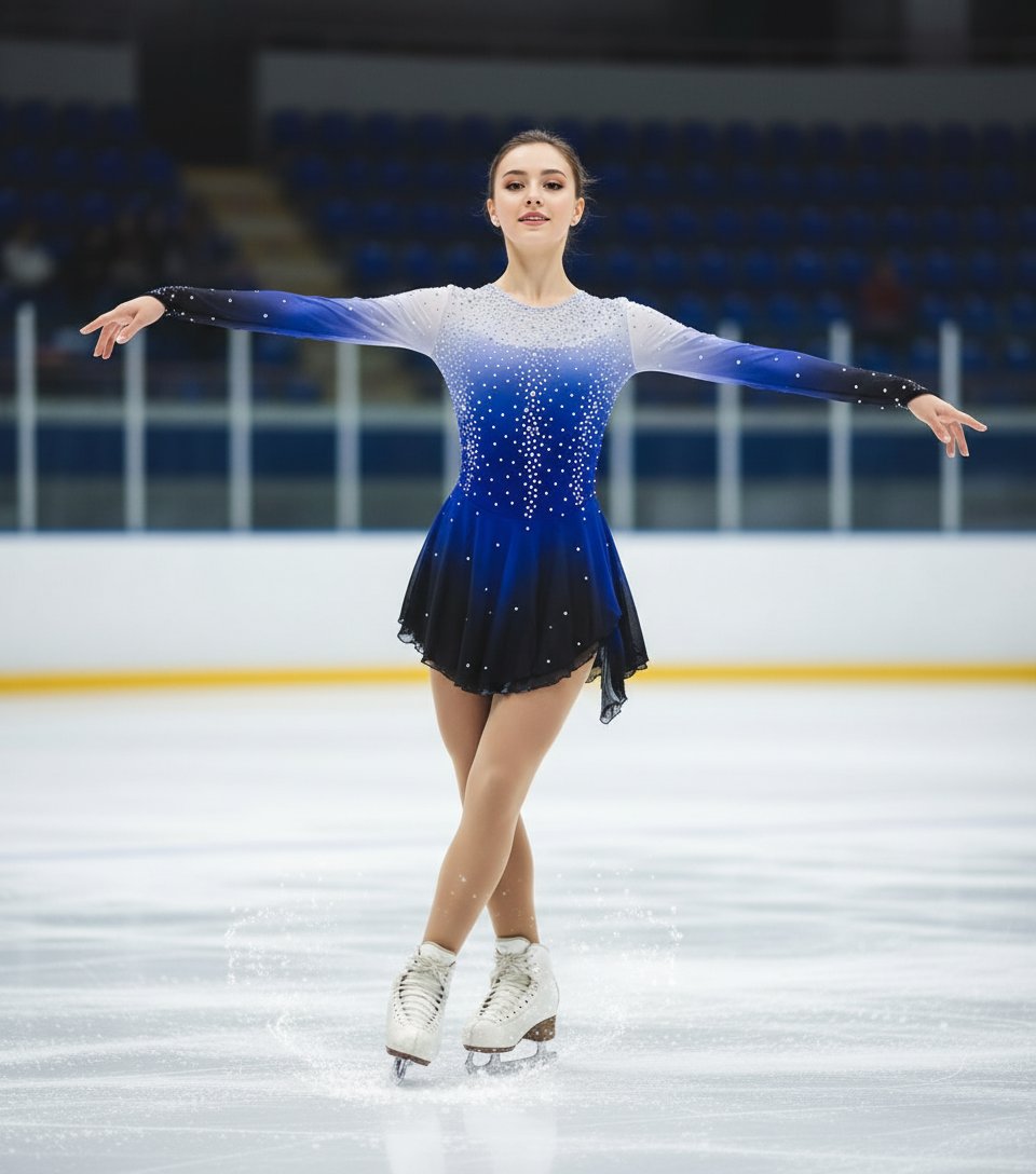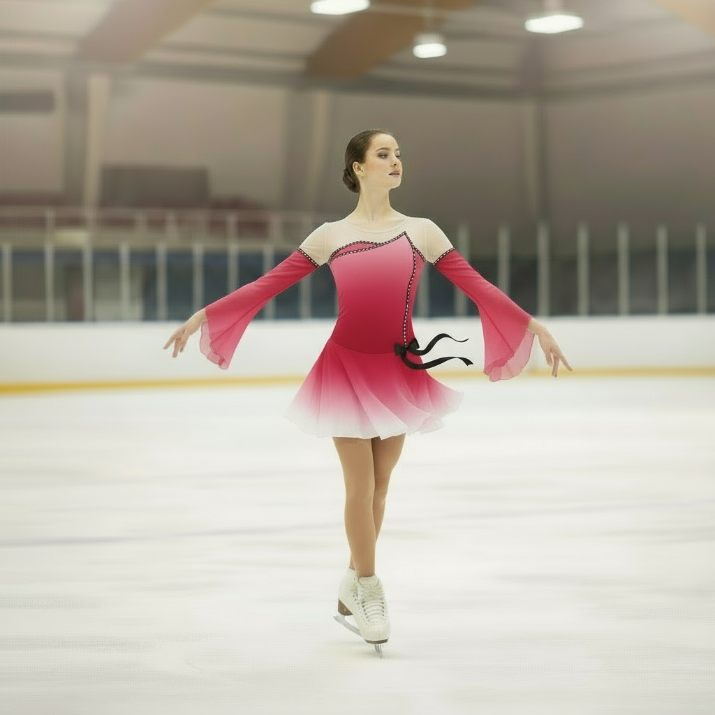 Designed for competitive skating, this dress offers a dynamic red to black or blue ombre gradient that captures attention on the ice. Its precise cut ensures optimal freedom of movement, allowing for fluid performance without compromise. Combining striking visual appeal with functional design, this dress supports advanced routines while projecting confidence and style.