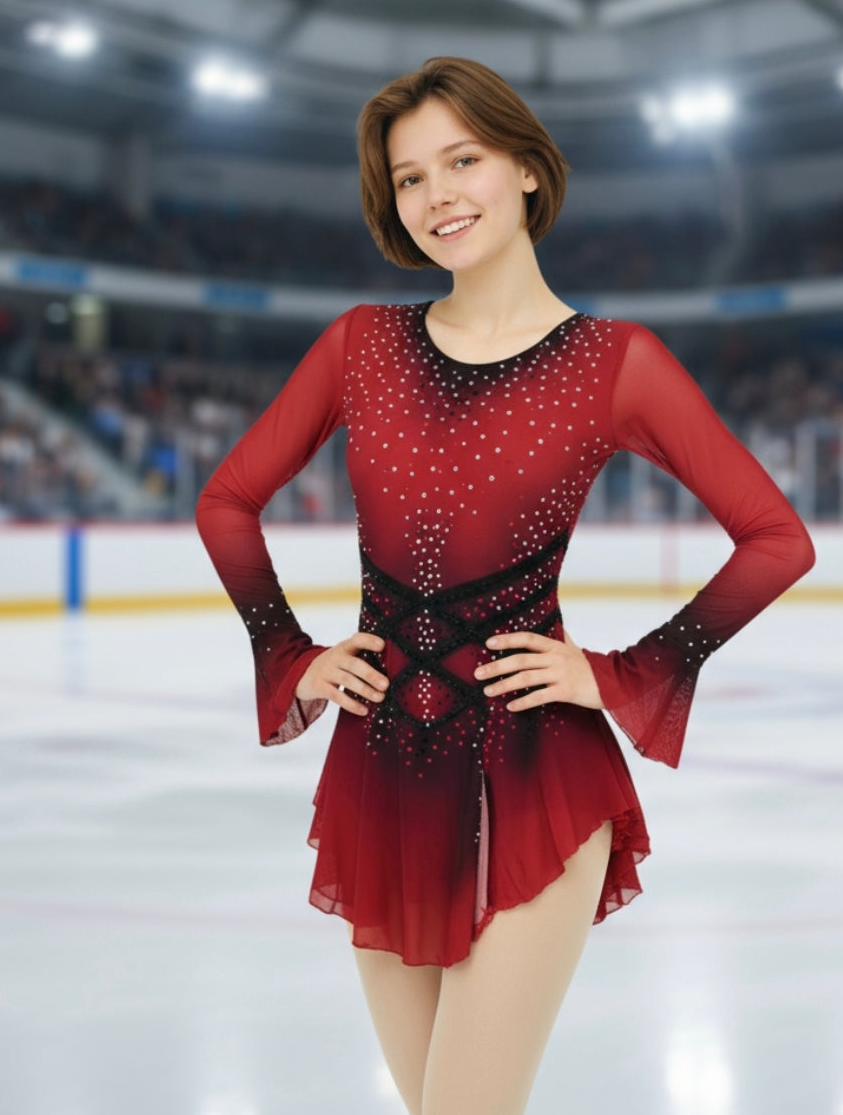 This Competition Skating Dress features a striking red to black ombre design that enhances presence on the ice. Crafted for performance, its streamlined fit allows for unrestricted movement while maintaining elegance. Ideal for competitive skaters seeking a bold yet sophisticated look, this dress combines style and function to help you stand out during routines.