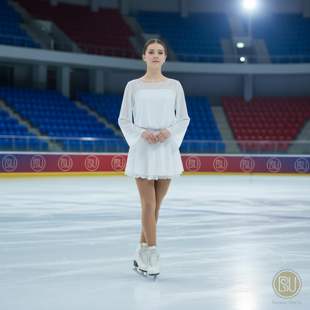 Figure Skating Dresses Rhinestones White Chiffon Long Sleeves sIze 8 to AXXL, BSU9154
